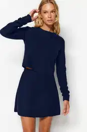 TrendyolNavy Blue Off-Shoulder Crew Neck Crop Thessaloniki/Knit Look Knitted Blouse