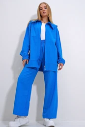 trend alaçatı stiliTrend Alaat Stili Women's Sax Polo Collar Zippered Jacket and Trousers Double Suit