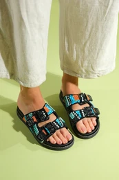 luvishoesJAMES Black Stoned Double Banded Genuine Leather Women's Slippers